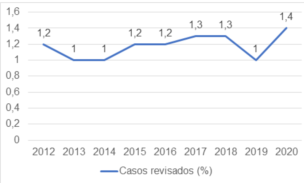 El comportamiento del porcentaje de casos aceptados no aumentó de manera sostenida, pese a la caída del total de apelaciones (gráfico 2). El año 2020 tuvo el valor más alto, con 1,4%, pero esto fue solo un crecimiento de 0,2 puntos porcentuales con respecto a 2012. La tendencia observable fue hacia una estabilidad relativa del porcentaje, con fluctuaciones en torno a la línea de 1,2%. En cuanto al total de casos aceptados, este valor osciló entre los 60 de 2019 y los 72 de 2020.