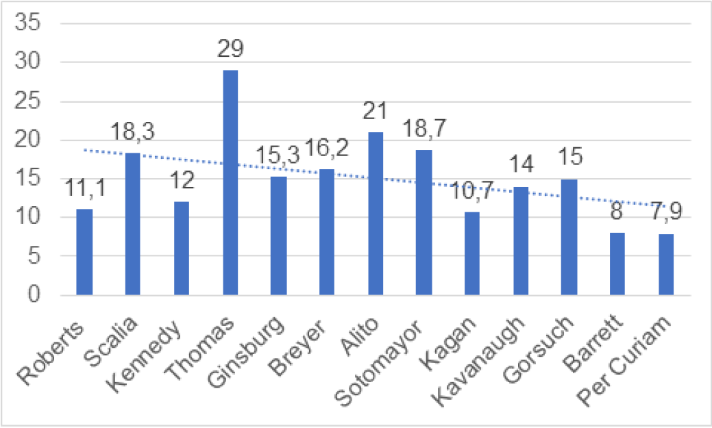 En los 10 términos incluidos, el promedio general fue de 14,8 decisiones anuales por juez. Se observó claramente que a lo largo de ese período existió un núcleo de jueces particularmente activos, con números anuales por encima de la media: Thomas —ampliamente el más activo—, Alito, Sotomayor, Scalia y, en menor medida, Breyer. El resto estuvo por debajo del promedio, con casos particularmente poco activos como Kennedy, Roberts, Kagan y Barrett. Lo que se aprecia es una asimetría interna en la Corte, con algunos liderazgos claros, que no dependen de la jerarquía nominal.