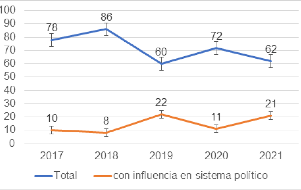En algunos puntos ampliamos el marco temporal para ofrecer una perspectiva más completa de los fenómenos estudiados. Esto fue un recurso para poder identificar tendencias relativamente sostenidas, para las cuales los cinco años de la etapa seleccionada no serían suficientes. Determinar esas tendencias permitió delinear con mayor precisión las condiciones dentro de las que se desarrolló el período 2017-2022.