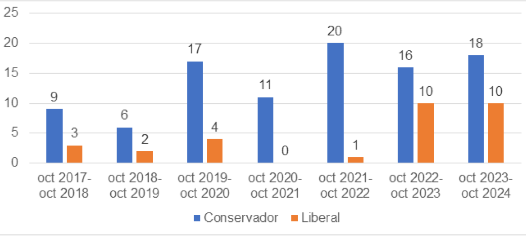 Estos datos son expresión, en nuestro criterio, de la polarización partidista de la Corte, lo cual pone en entredicho su imparcialidad. Actualmente, la filiación partidista de los presidentes que nominaron a los jueces es un buen predictor de sus votaciones, particularmente en casos de relevancia política o que tocan temas polarizantes, como los identificados por el Pew Research Center (2019). Ello incluyó decisiones a contrapelo de factores técnicos supuestamente apolíticos. Como vimos antes, esta tendencia y esa composición han hecho que las decisiones tomen un matiz marcadamente conservador, y que los jueces liberales crecientemente se vean reducidos a disentir de las sentencias y opiniones mayoritarias.