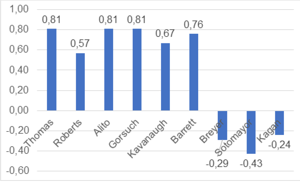 Aquí se extrajeron dos ideas: primero, la menor variación entre los liberales indicó que son menos propensos al compromiso, lo cual puede ser explicado por la necesidad de mantener un frente lo más unido posible para poder avanzar su agenda y perspectivas, al encontrarse en minoría; segundo, existen jueces “bisagra”, es decir, jueces que tienden a votar menos en línea partidista, y que, en condiciones de un reparto 5-4, como era el caso hasta 2020, pueden ser decisivos, si pertenecen a la mayoría. Esta función la cumplió el Juez Jefe Roberts. Sin embargo, la composición de 6 conservadores y 3 liberales prácticamente anula la influencia del juez bisagra, en particular uno como Roberts, fundamentalmente conservador en su actuación. La jueza Kagan no clasifica como “bisagra”, por ser parte de la minoría liberal, de manera que no cumple esa función.