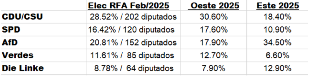 En este escenario de crisis se celebraron el 23 de febrero elecciones legislativas adelantadas (programadas para septiembre de 2025). La diferencia señalada entre el Este y el Oeste germano se ve claramente en la siguiente Tabla 1.